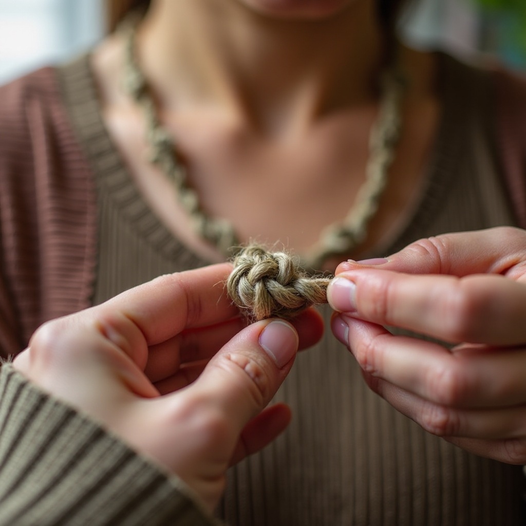 - Iniziare il tuo intreccio: Misura e taglia il tuo filo di canapa a circa quattro volte la lunghezza prevista della tua collana. Inizia con un semplice nodo per stabilizzare i fili mentre intrecci.